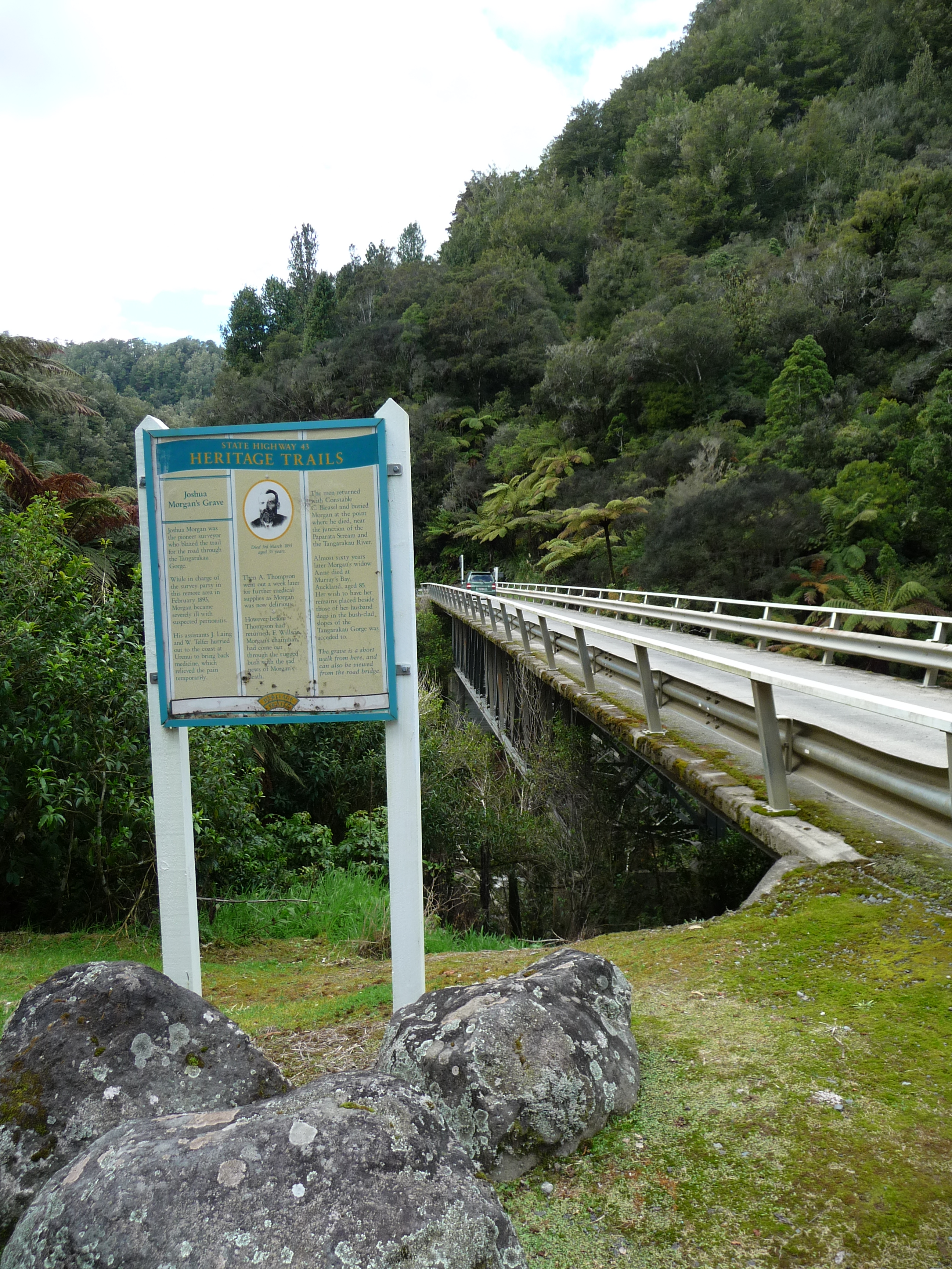 About half way along, nestled in some native bush is the grave of Joshua Morgan who surveyed much of the area and died while doing so. After a short walk through the bush and over a bridge you reach his grave – such a lovely, peaceful spot.